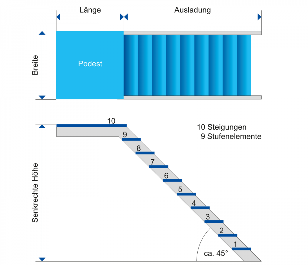 Bitte teilen Sie uns vor Bestellabschluss die genaue gewünschte senkrechte Höhe (Oberkante der letzten Stufe / Podest) mit.