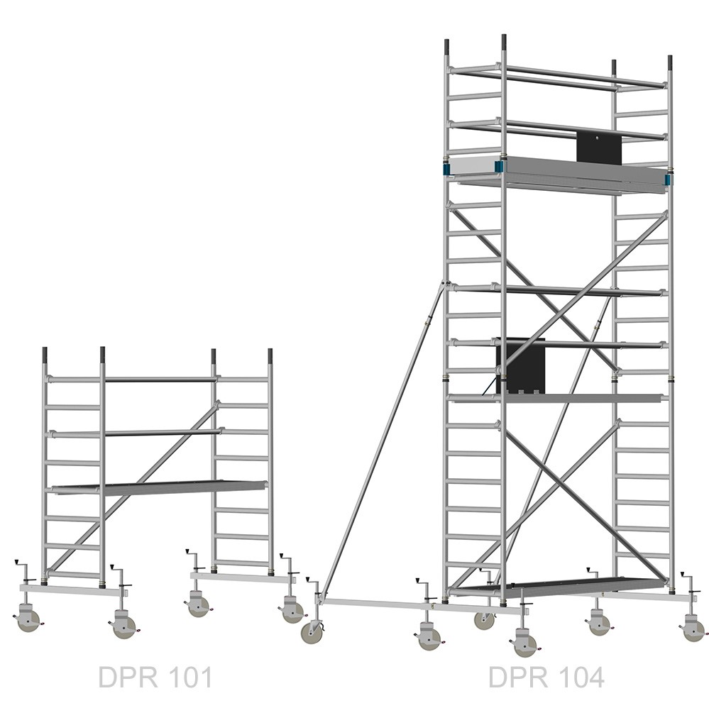 Unsere Fahrgerüste mit Rundsprossen entsprechen einer extra stabilen Industrieausführung. Der Aufbau ist kinderleicht, da es sich um einfache Steckverbindungen handelt. An den Diagonalen und Horizontalen (Geländer) sind Aluminiumklauen angeschweißt, welche formschlüssig über der Rundsprosse liegen. Eine spezielle Sicherung verhindert versehentliches Aushängen.